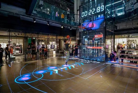 A Nike criou uma instalação em Xangai e, usando a impressão em grande formato e a realidade aumentada, os visitantes podiam ver os movimentos projetados em tempo real e em enormes telas, criando uma experiência interativa única.